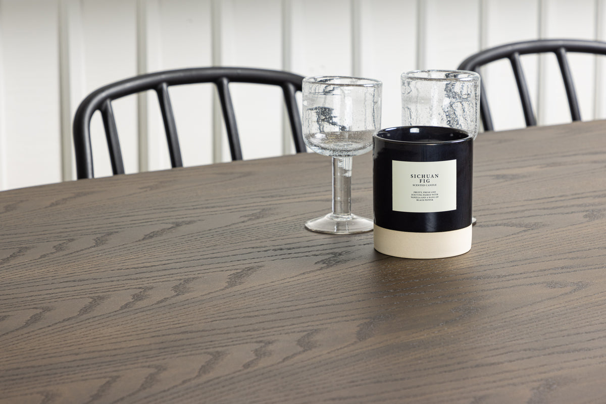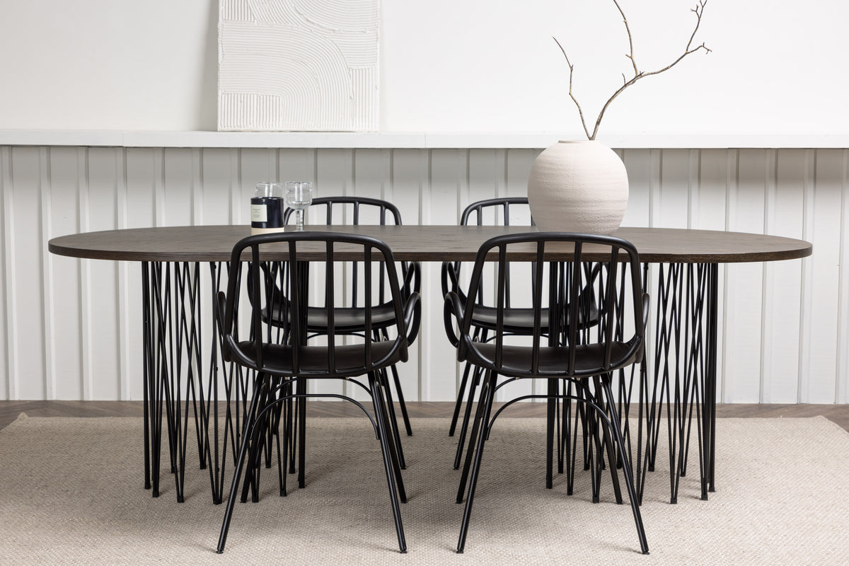 Skapa en personlig känsla i vardagsrummet! Vårt ovala matbordet Stone imponerar med sin modemedvetna design. Bordet har en vacker brunfärgad bordsskiva i MDF med faner och två dekorativa cylinderformade stommar i svart metall. Här tillsammans med 4st matstolar från serien Dyrön. Stolen är lika stilren som praktisk, tillverkad i svart plast och stål. Sitsen har integrerade armstöd och en ribbad design i den lätt rundade ryggen. Lika tålig som stilren! Bordets mått: 220x100cm.