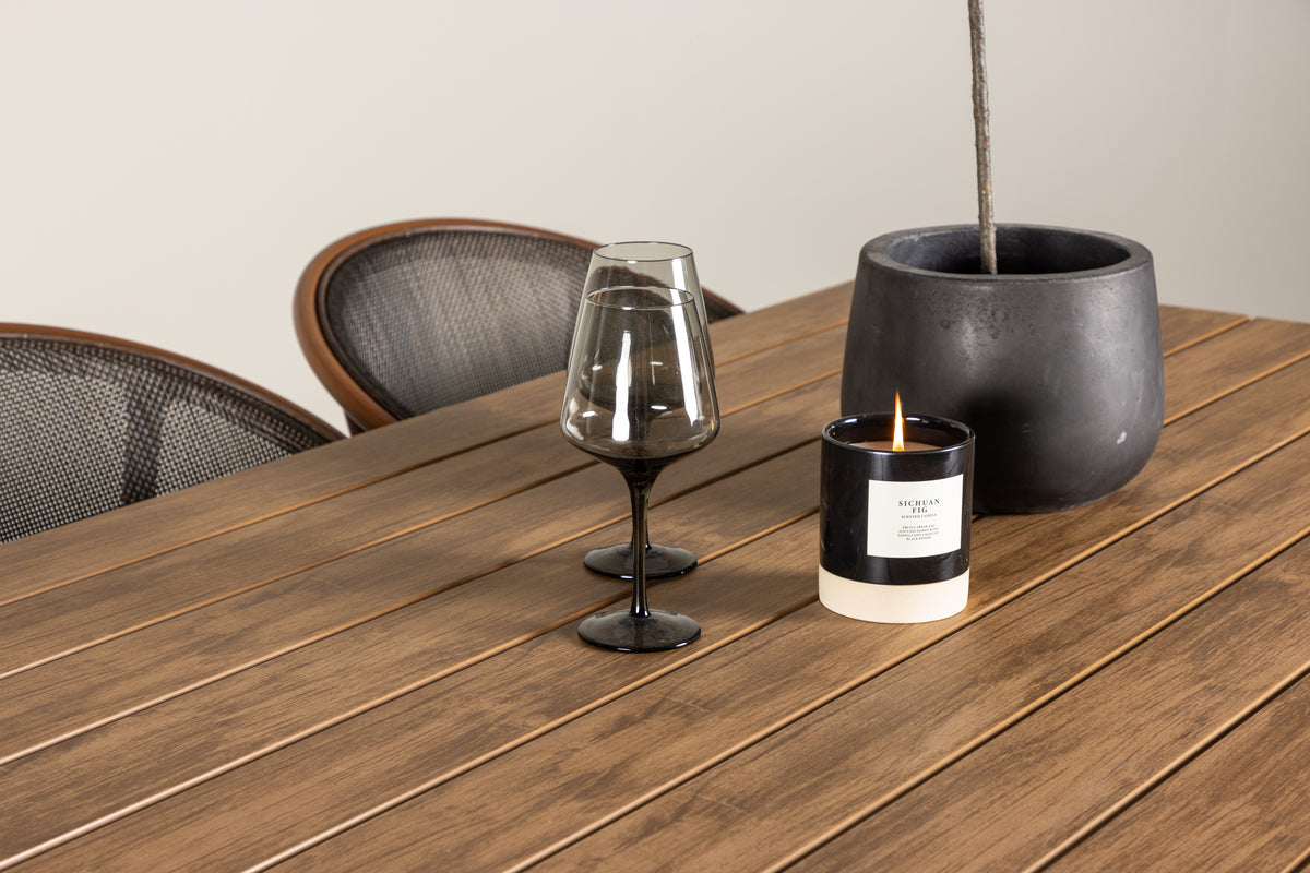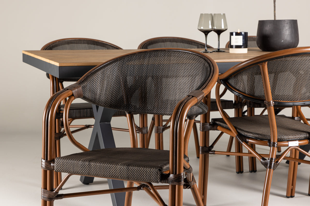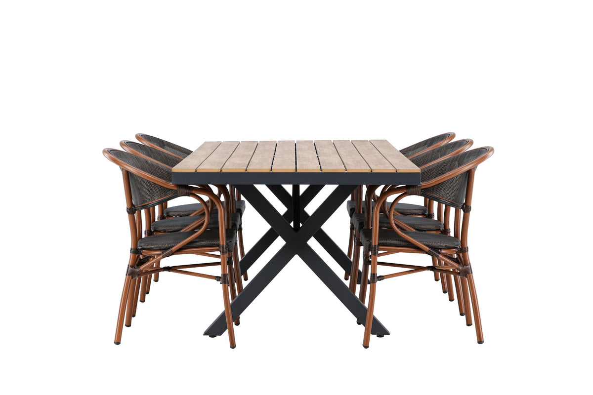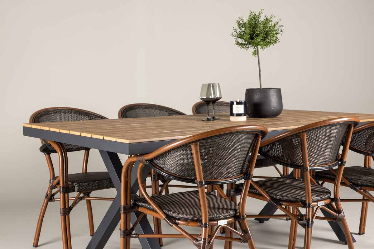 Upptäck den perfekta platsen för umgänge med vänner och familj med vår nya matgrupp - Vila och Garcia. Med en imponerande design och en neutral känsla kommer detta ensemble att förhöja din utomhusmiljö till en ny nivå av komfort och stil. Vila stolarna är skapade med fokus på komfort. Deras sits i svart teslinmaterial och stomme i brunt aluminium kombinerar elegans med komfort. Dessa stolar är utformade för att ge en bekväm sittupplevelse under långa måltider utomhus. Garcia bordet utgör mittpunkten i denna matgrupp med sina imponerande dimensioner på 200x74 cm. Med en bordsskiva i brunt fanérmaterial och en stomme i svart aluminium erbjuder det en stilren och modern design som passar perfekt för alla utomhusmiljöer. Denna matgrupp är idealisk för utomhusbruk och fungerar som en inredningsdetalj som samlar vänner och familj. Med sex stolar inkluderade är detta set komplett för att skapa minnesvärda stunder och njuta av avslappnade måltider utomhus.