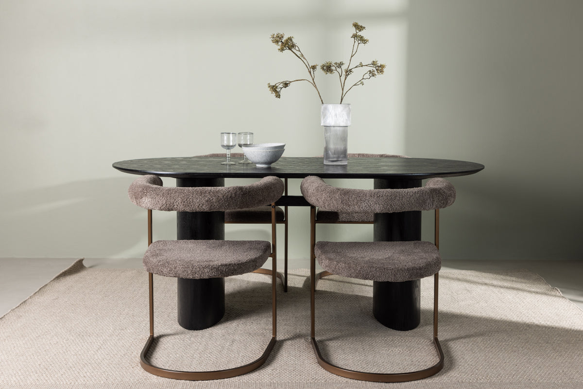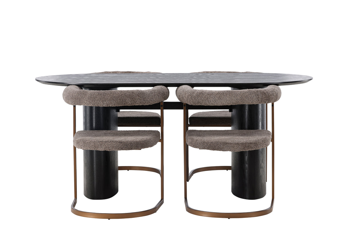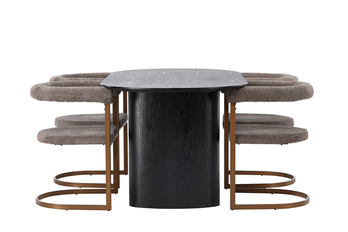 Skapa en rustik och modern atmosfär med den här pampiga matgruppen i skandinavisk stil - Enastående utformning och komfort! Vårt svarta ovala matbord Isolde imponerar med sin moderna design. Den ovala bordsskivan i MDF med faner synliggör materialets vackra mönster och den robusta stommen ger stadighet till blickfånget. Bordets mått: 180x75cm. Här tillsammans med våra moderna matstolar Morning. Stolen har en genomtänkt design som kombinerar stil och bekvämlighet på ett fantastiskt sätt. Den rundade stolsryggen och den stoppade sitsen i svart boucle-tyg bjuder in till trivsamma och bekväma måltider. Sist men inte minst, med den minimalistiska ramkonstruktionen i svart stål får du en stilren och unik touch som är perfekt för moderna inredningar. Upplev en känsla av lyx och välbehag när du njuter av middagar med familj och vänner runt den här matgruppen. Låt den eleganta designen och den enastående komforten ta din matupplevelse till nya höjder!