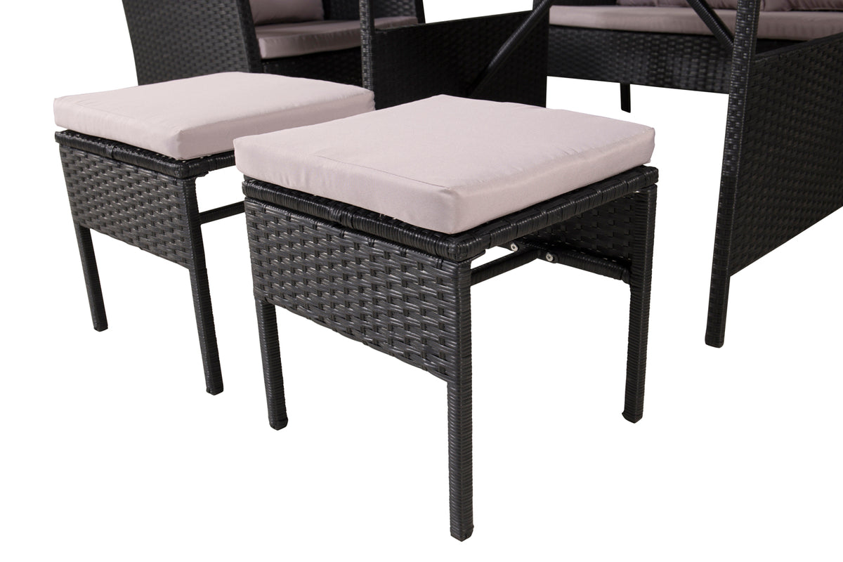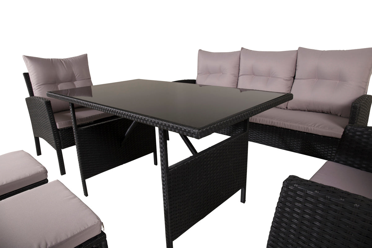 Knock skapar ett inbjudande blickfång till din uteplats! En modern mångsidig soffgrupp i svart konstrotting som passar utmärkt både till altanen eller uterummet. Soffgruppen består av en tresits soffa, två karmfåtöljer samt två pallar, inklusive gråa pickerade mjuka dynor samt ett rektangulärt matbord med en bordsskiva av svart glas. Lättare montering krävs. Tips: pallarna kan användas som extra sittplats eller som fotpall till fåtöljerna eller soffan. Skötselråd: Konstrotting är ett plastmaterial som passar alldeles utmärkt för vårt skandinaviska klimat. Materialet är UV-beständigt och tåler väder och vind. Att det är UV-beständigt gör att möblerna inte bleknas, däremot rekommenderar vi alltid att förvara möblerna under ett möbelskydd eller på annat vis torrt och svalt – för att förlänga livslängden.