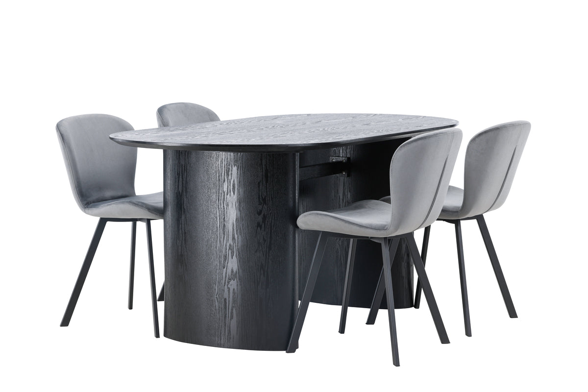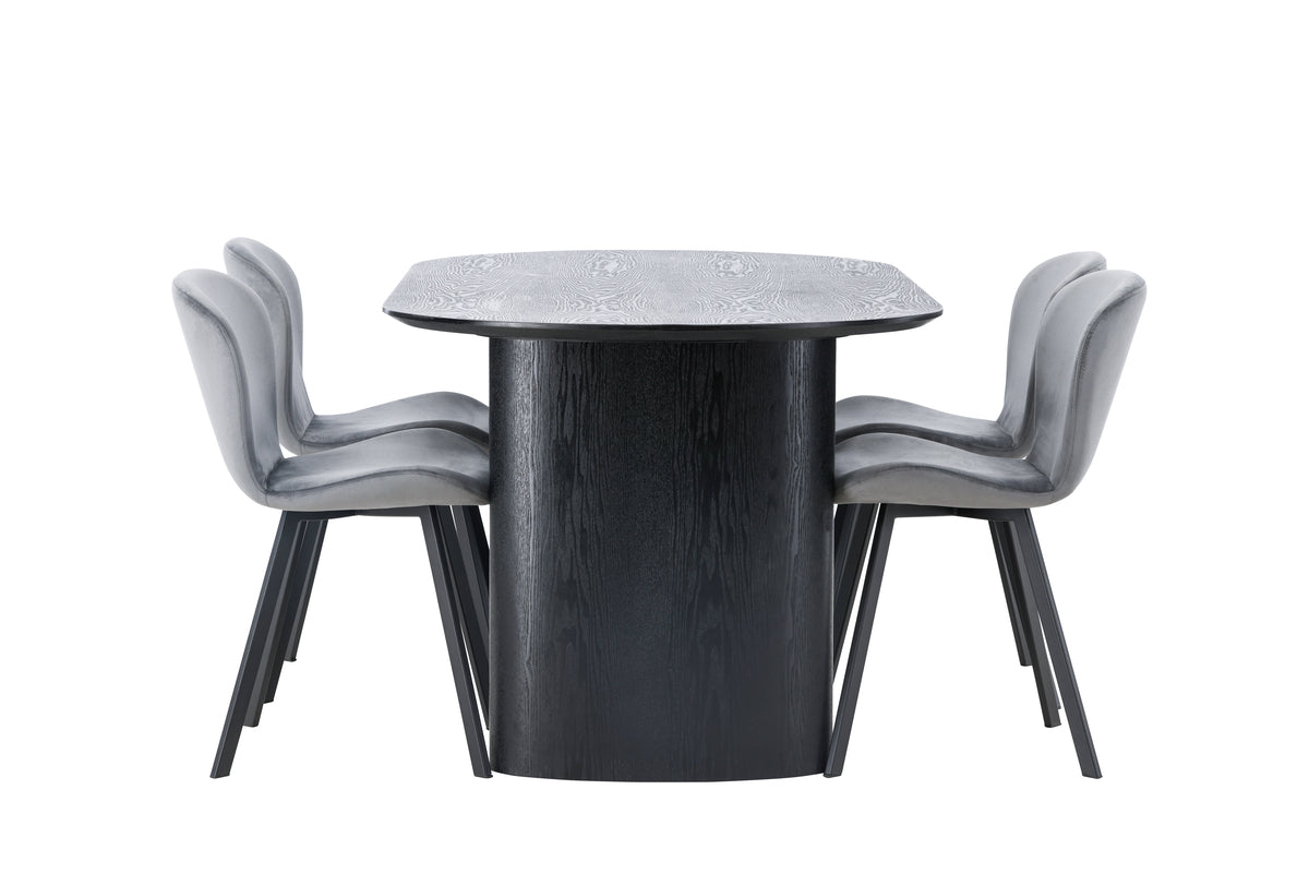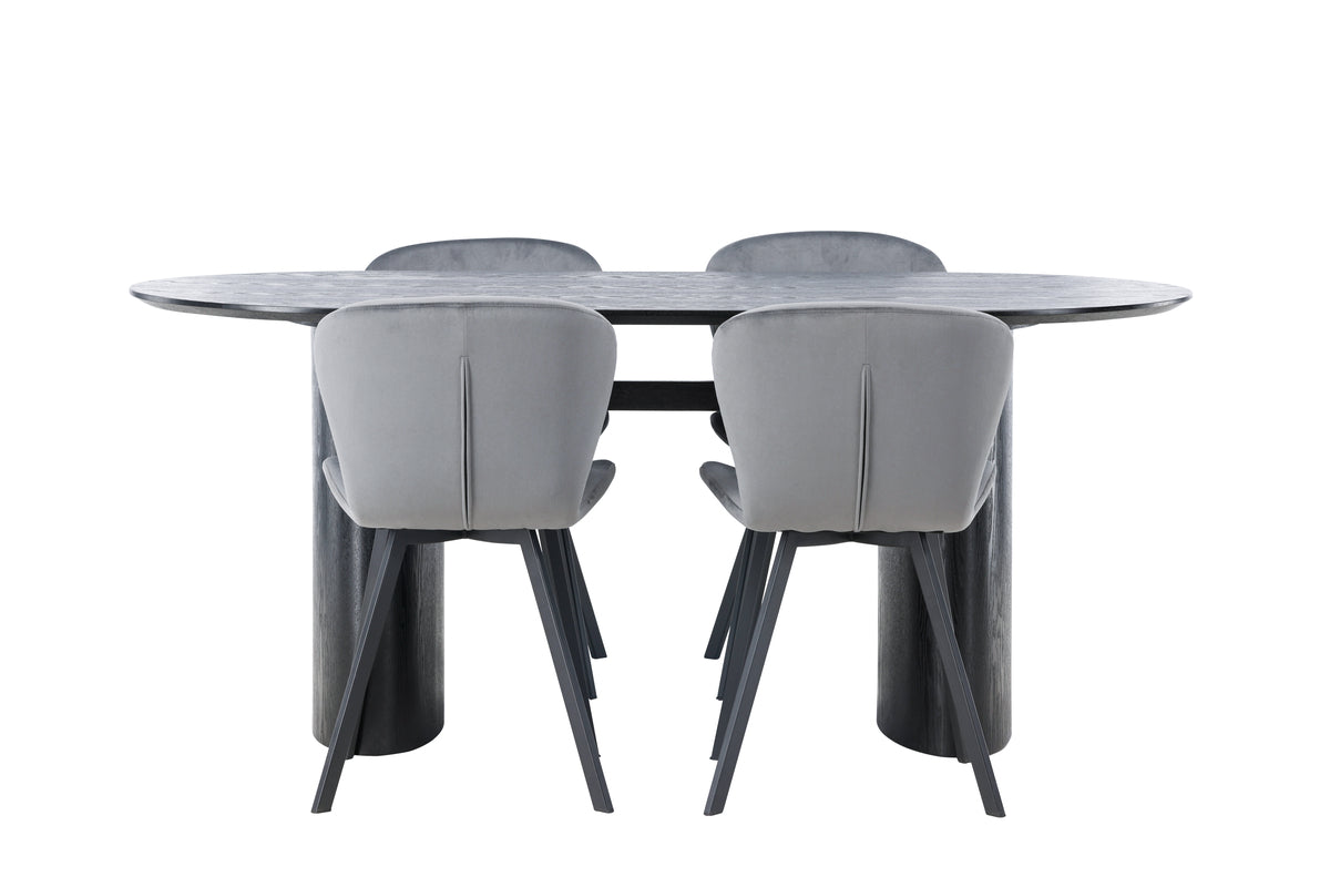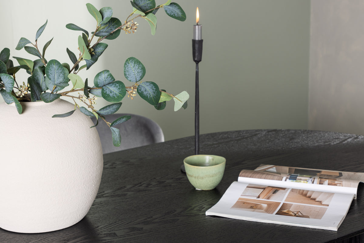 En behaglig färgkombination! Det ovala matbordet Isolde i svart kulör har en modern utformning med en oval bordskiva i MDF och robust stomme som ger ett stadigt intryck. Det levande materialet ger smakfull rörelse till blickfånget. Här i underbar kombination med beigea matstolar från serien Lilja. Stolen har en följsamt rund utformning med en sits i beige polyestertyg samt lätt utsvängda stolsben i svart metall. Möblera vardagsrummet hemtrevligt! Bordets mått: 180x75cm.