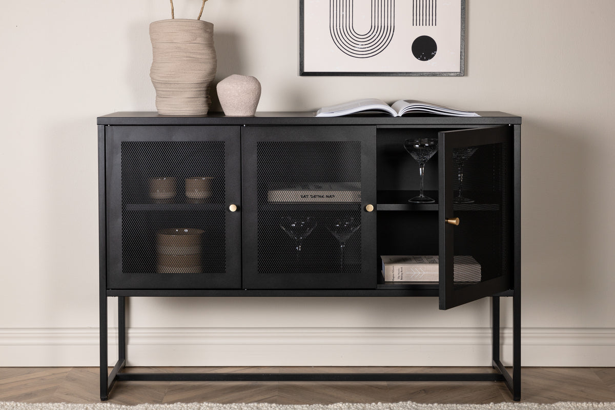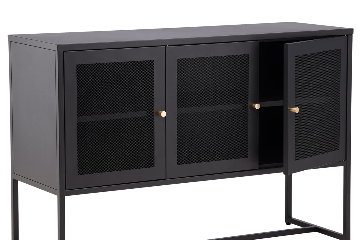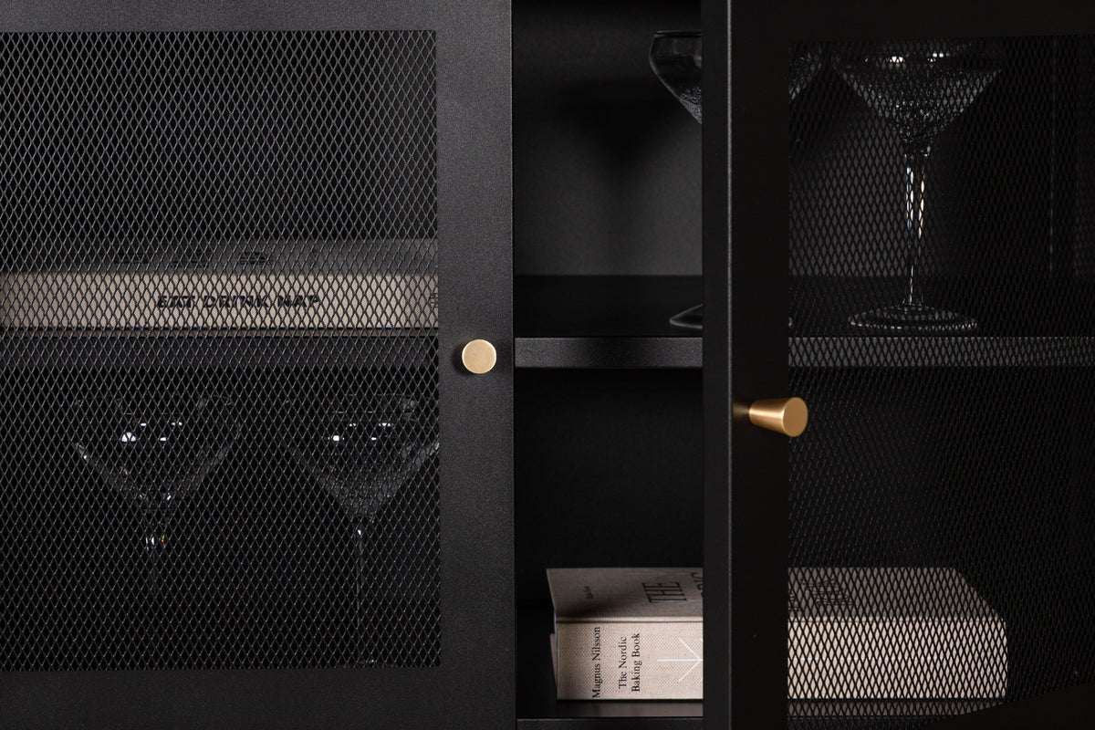 Malla - ett modernt skåp i en tuff industriell design med läckra nätdörrar och ben tillverkade i svart pulverlackerad stål med 2 smarta hyllplan för avlastning. Skåpet lyfts upp av smala, höga ben som skapar en luftig känsla och underlättar även för dammsugaren. Den perfekta förvaringsmöbeln för allt du önskar - fyll med porslin, böcker eller vackra dekorationer. Skåpets smidiga storlek och eleganta utsida gör den lättplacerad och passar bra in i de flesta rum i hemmet, så möblera efter egna behov och önskemål!