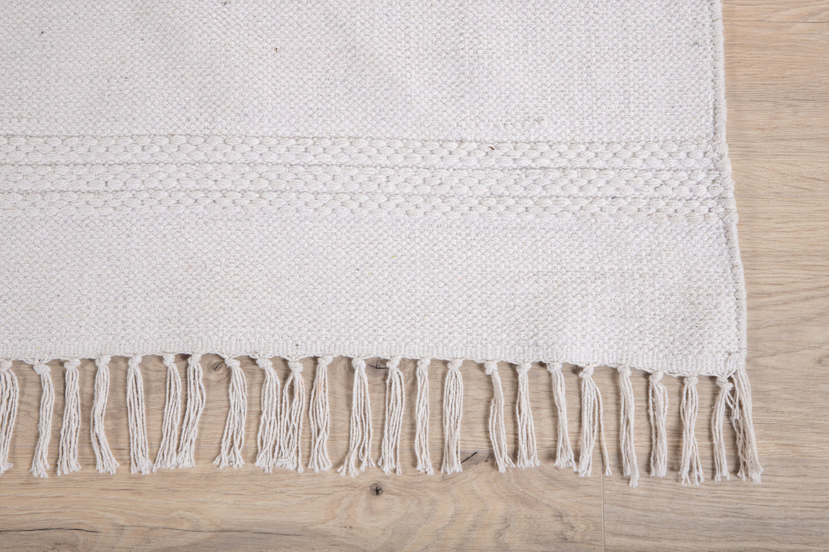 En ljus och fräsch inredningsdetalj med läckra detaljer. Mattserien Nico erbjuder handvävda rektangulära mattor i olika kulörer och storlekar. Den här benvita mattan har flätade detaljer och dekorativa fransar på kortsidorna som ger liv och rörelse till blickfånget. Placera framför soffgruppen eller i sovrummet och låt mattan bli en schysst inredningsdetalj att värma fötterna på. Mattans mått: 200x300 cm. Tips för Bomullsmattor: Bomullsmattor får inte tvättas eller torktumlas. Fläckar ska behandlas omgående med ofärgad trasa för att snabbt absorbera upp så mycket som möjligt. Regelbunden och försiktig borstning och dammsugning är att föredra för att minska risken att damm och smuts sätter sig ner i fibrernas rötter. Direkt solljus kan leda till missfärgning, se därför till att rotera mattan för jämn exponering.