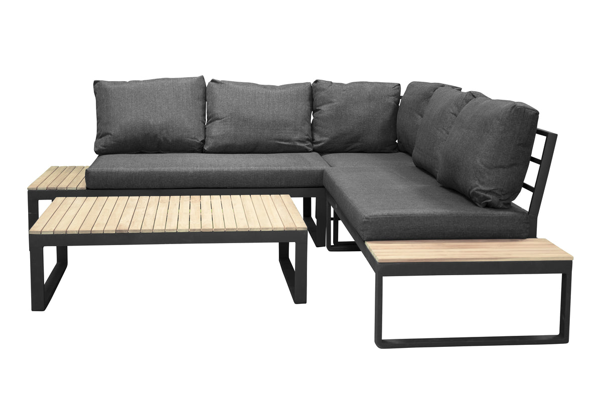 Panama är en modern hörnsoffa med fyra sittplatser och en hörndel. Soffan har två stycken fasta sidobord tillverkat i svart pulverlackerad metallram samt akacia på bordsytorna. Mörkgrå dynor ingår. Skapa en charmig och iögonfallande plats på uteplatsen att samla familj och vänner kring en varm sommarkväll och njut av bekvämligheten! Skötselråd: För att dina utemöbler i Akacia/hårdträ ska bibehålla sin finish bör de oljebehandlas. Eftersom träslagen i sig inte är lika feta av naturen behöver de oljas lite då och då, även under säsong.