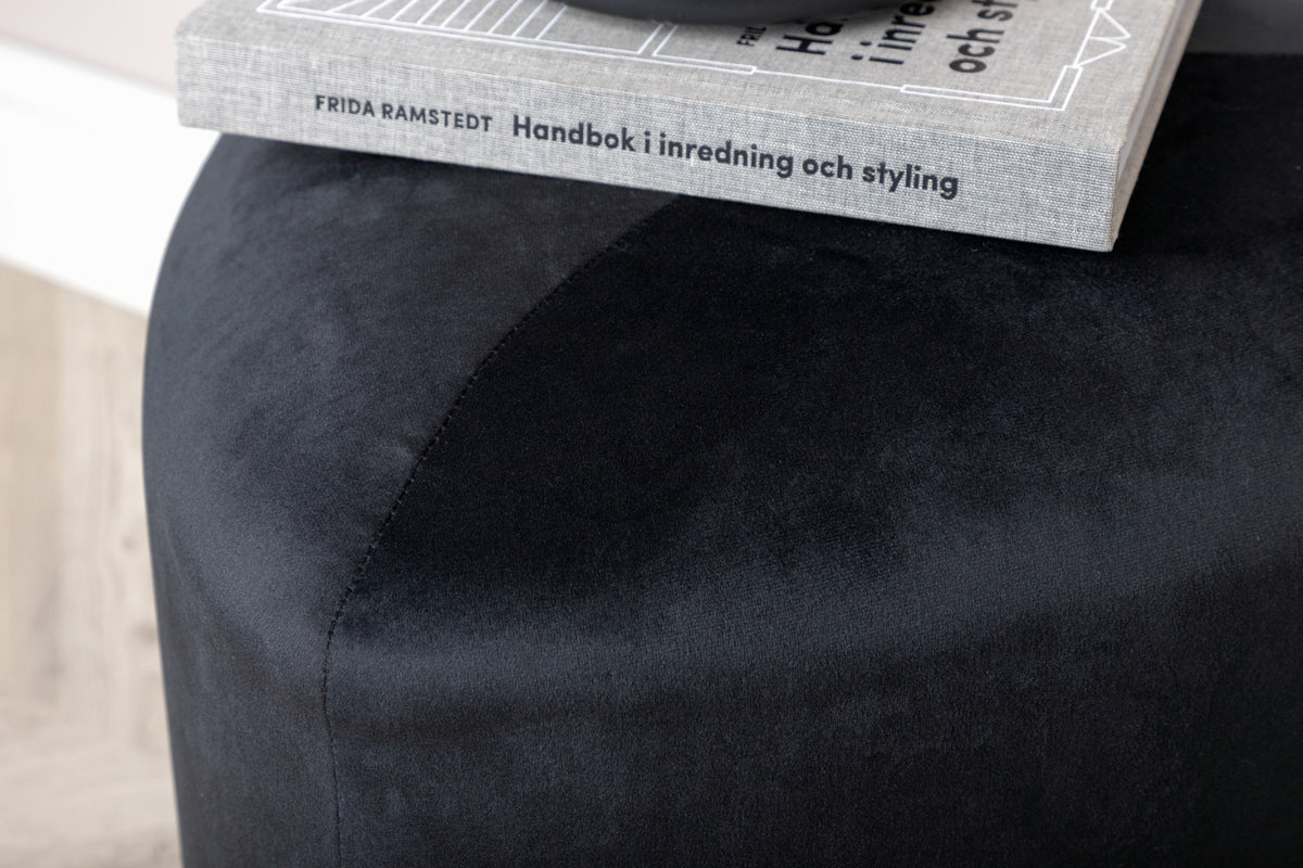 Den triangelformade sittpuffen Peg skapar snabbt en stilmedveten atmosfär och blir garanterat ett smart tillskott i ditt hem! Med sina mjuka former och sammetslena yttre i kaxig svart kulör får sittpuffen ett elegant lyster som blir en iögonfallande detalj. Använd som fotpall att vila fötterna på, som extra sittplats när gästerna blir många eller placera som en stilikon intill övrigt möblemang - bara fantasin sätter gränser! Tillverkad i materialen skum, bomullsfiber, sammetstyg och böjt trä. Puffens mått: Höjd: 41 cm, diameter: 46 cm. Skötselråd: Sammet har en tendens till att få tryckmärken när luggen lägger sig ner. Avtrycken kan göra att tyget ser slitet ut, vilket här helt normalt för den här typen av material. Beroende på hur ljuset faller kan tyget skifta i flertalet olika nyanser.