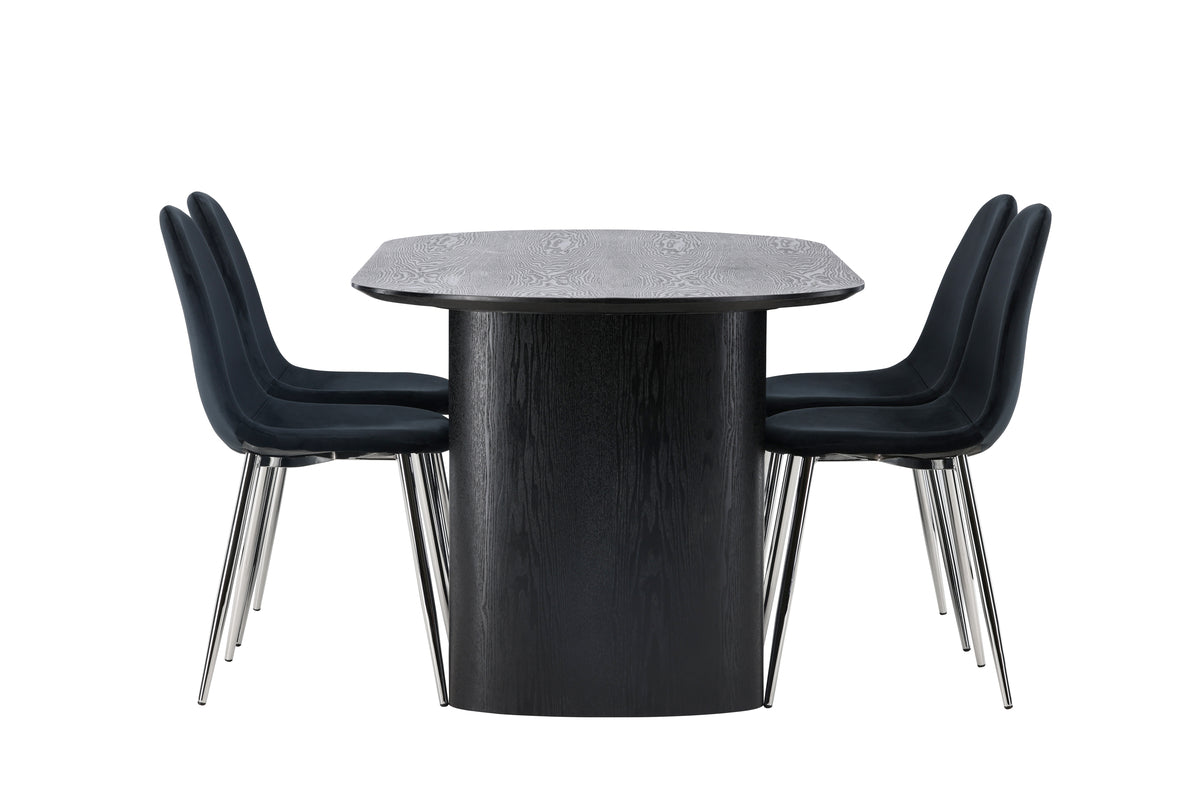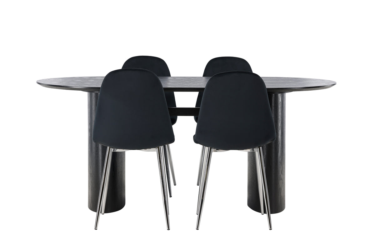 Skapa en imponerande look i vardagsrummet! Det ovala matbordet Isolde i svart kulör har en modern utformning med en oval bordskiva i MDF och robust stomme som ger ett stadigt intryck. Det levande materialet ger smakfull rörelse till blickfånget. Här i modern kombination med svarta matstolar från serien Polar. Stolen har en helklädd design med ben i kromad metall, en lätt rundad rygg och sits i smäckert svart sammetstyg med mjuk stoppning för extra komfort. Kan det bli bättre? Bordets mått: 180x75cm.
