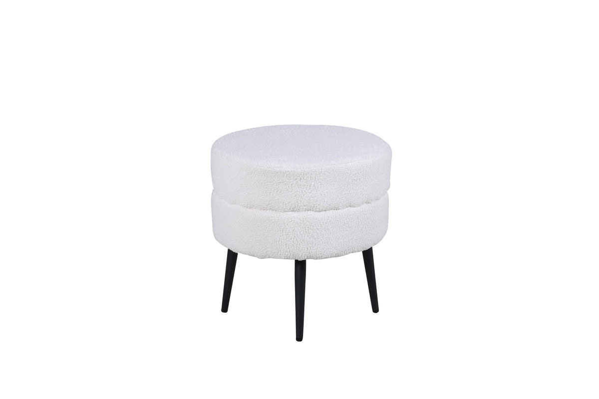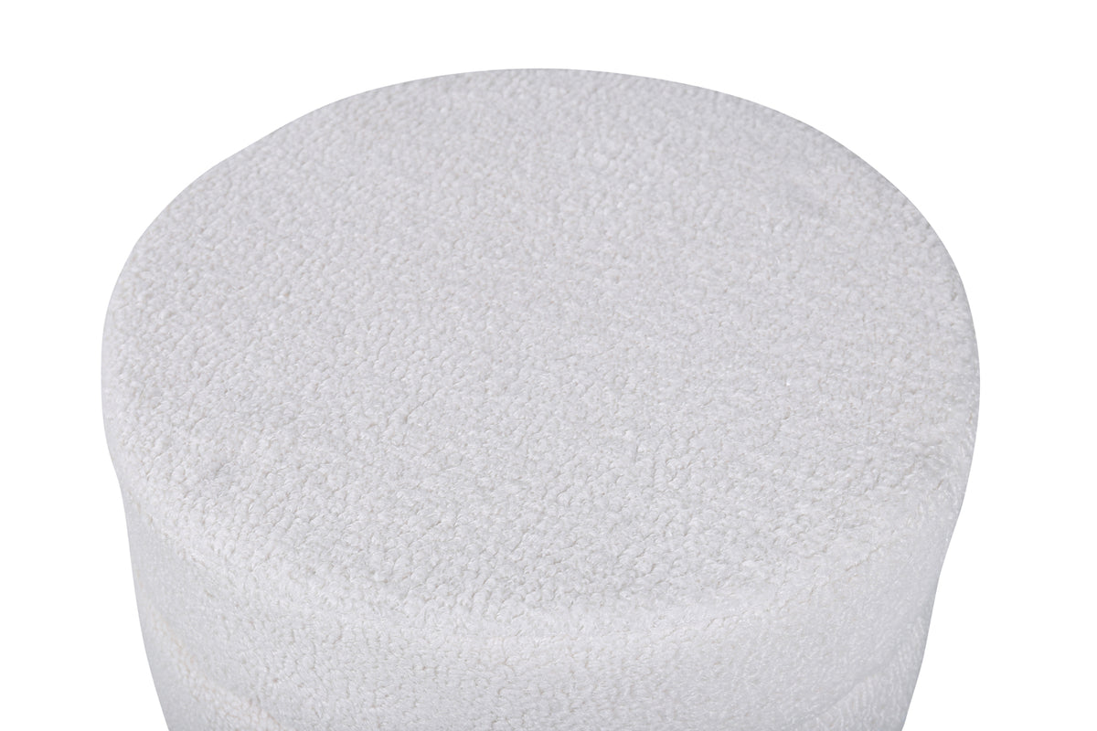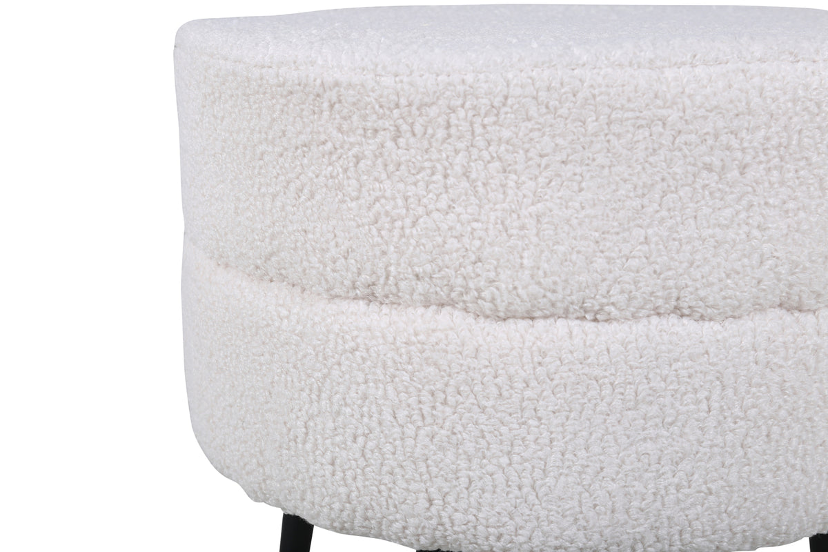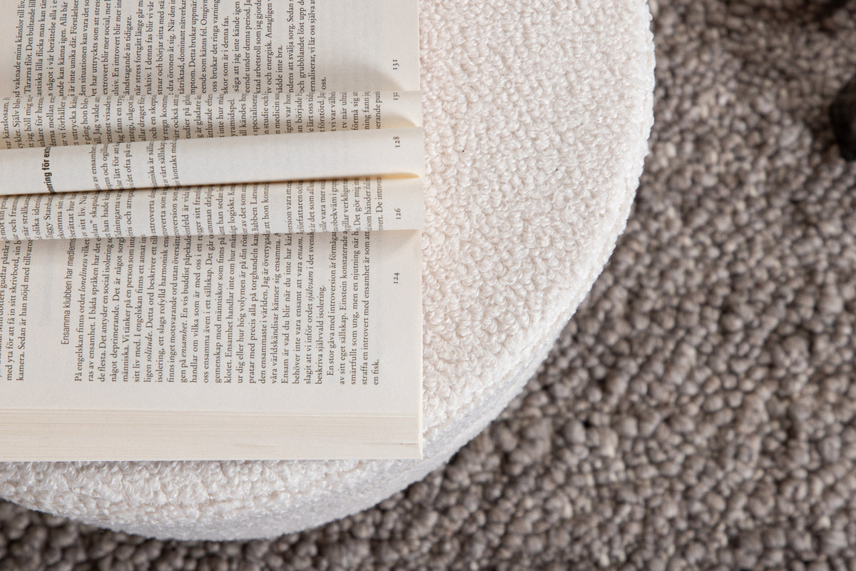En enkel och diskret fotpall som trots sin nätta storlek imponerar med sin trendiga design och moderna teddytyg. Pot är en sittpuff i läcker benvit kulör tillverkad av materialen skum, bomullsfiber, tyg och böjt trä. Benen är lätt utsvängda i svart stål och bidrar till en luftig känsla. Puffens mått: Höjd: 40 cm, diameter: 40 cm. Lika praktisk som snygg är den här sittpuffen lättplacerad och har flera användningsområden - lägg upp fötterna, erbjud en extra sittplats eller placera solitär som en schysst inredningsdetalj! Skötselråd: Ta bort fläckar med en gång, gnid inte utan försökt suga upp varsamt med en trasa. Skulle fläckarna inte gå bort, prova ett fläckborttagningsmedel som du först provat på en mindre synlig del av tyget.