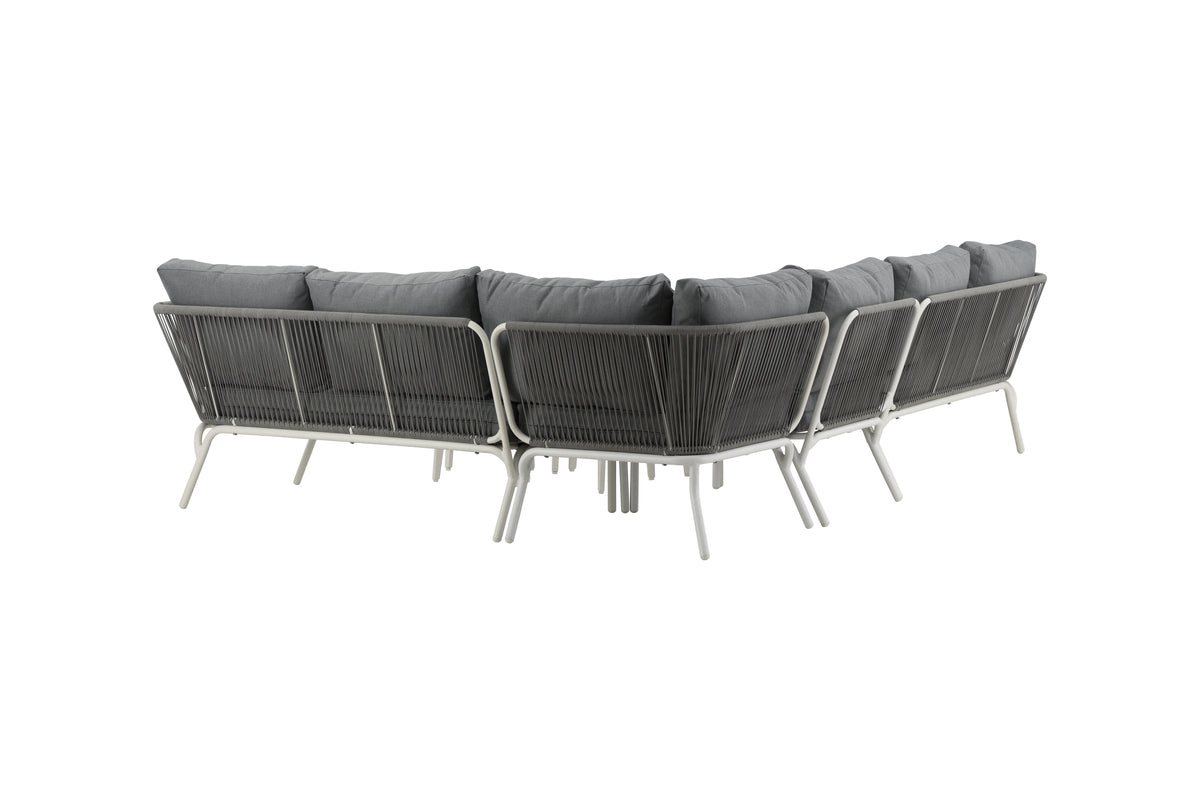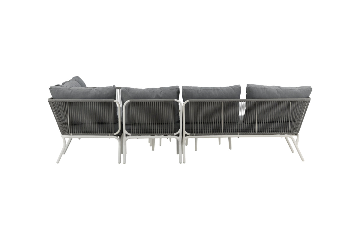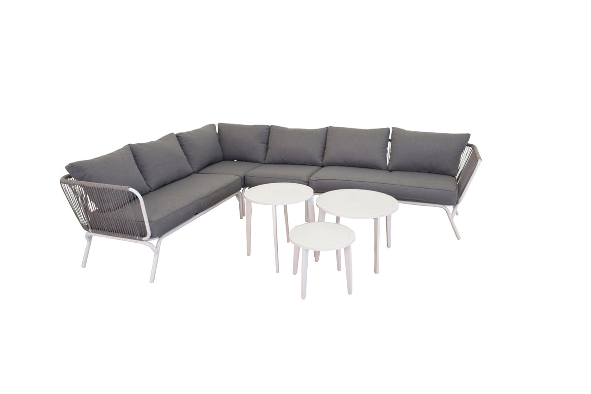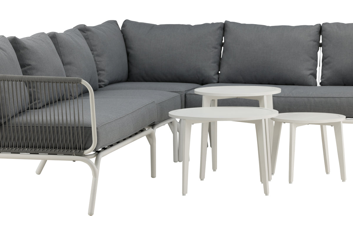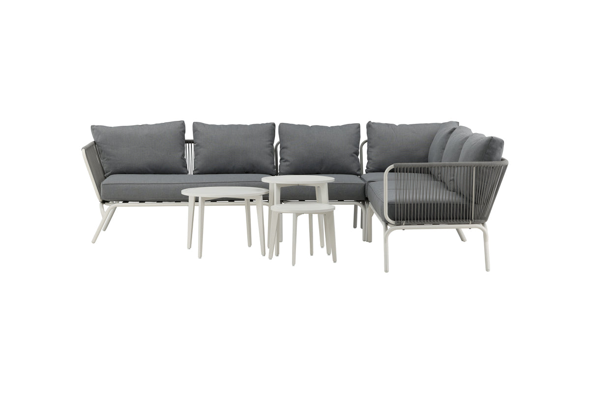 Skapa en mysig plats att samla nära och kära kring i sommar - här sitter ni avkopplat och bekvämt i timmar! Roxo är en trendig soffgrupp i stilren design som passar utmärkt till uteplatsen eller uterummet. Soffgruppen består av en hörnsoffa med 5 sitsplatser och en hörndel, tillverkat i en slitstark design i vit pulverlackerad metall med en rygg som är designad i ljusgrått rep samt stilrena satsbord i tre delar i vit pulverlackerad metall. Grå mjuka dynor ingår till soffgruppen! Skötselråd: Utemöbler i aluminium och rostfritt stål bör rengöras regelbundet med vatten och mild tvål. Skölj alltid noggrant med rikligt med vatten, något som blir extra viktigt om möblerna är placerade på ett havsnära avstånd där salt kan transporteras via luften.