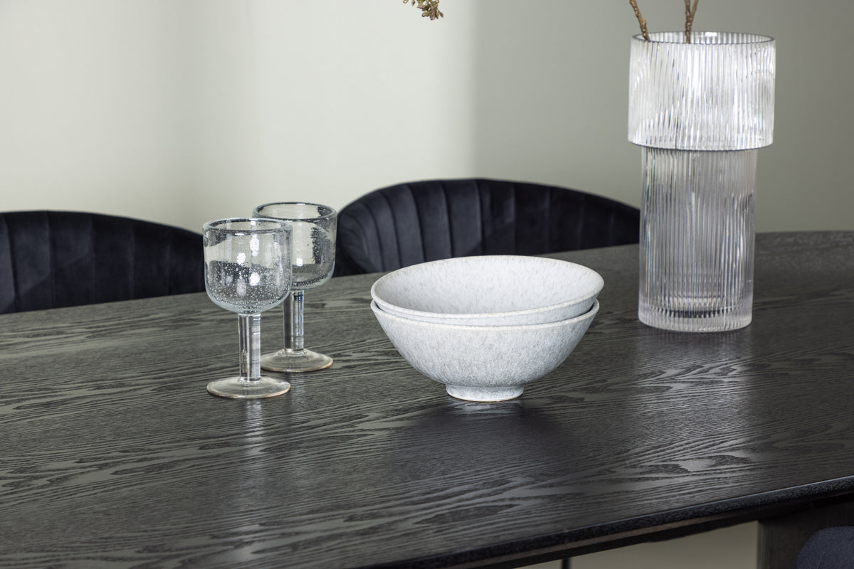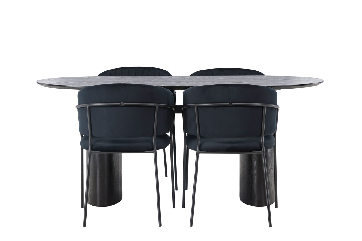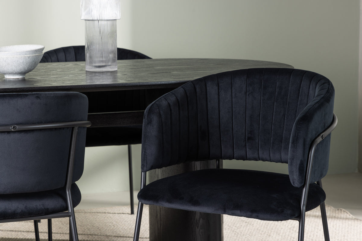 En otrolig kombination! Det ovala matbordet Isolde i svart kulör har en modern utformning med en oval bordskiva i MDF och robust stomme som ger ett stadigt intryck. Det levande materialet ger smakfull rörelse till blickfånget. Här i perfekt kombination med svarta matstolar från serien Selma. Stolen har en helklädd design med lätt rundad rygg och sits i sammetstyg med snygga dekorsömmar och benen är smala i svart stål – garanterat lika snygg som bekväm. Bordets mått: 180x75cm.