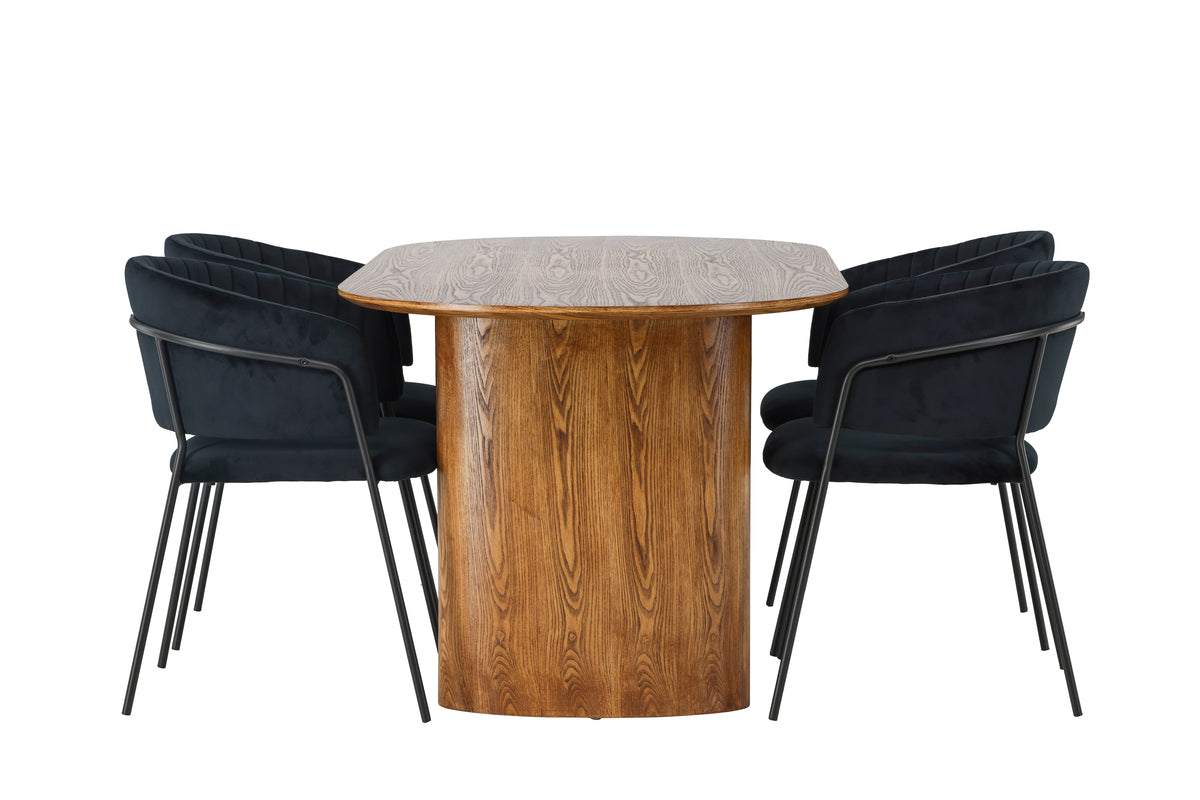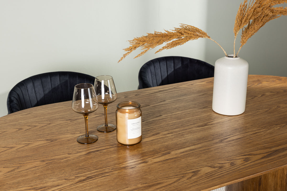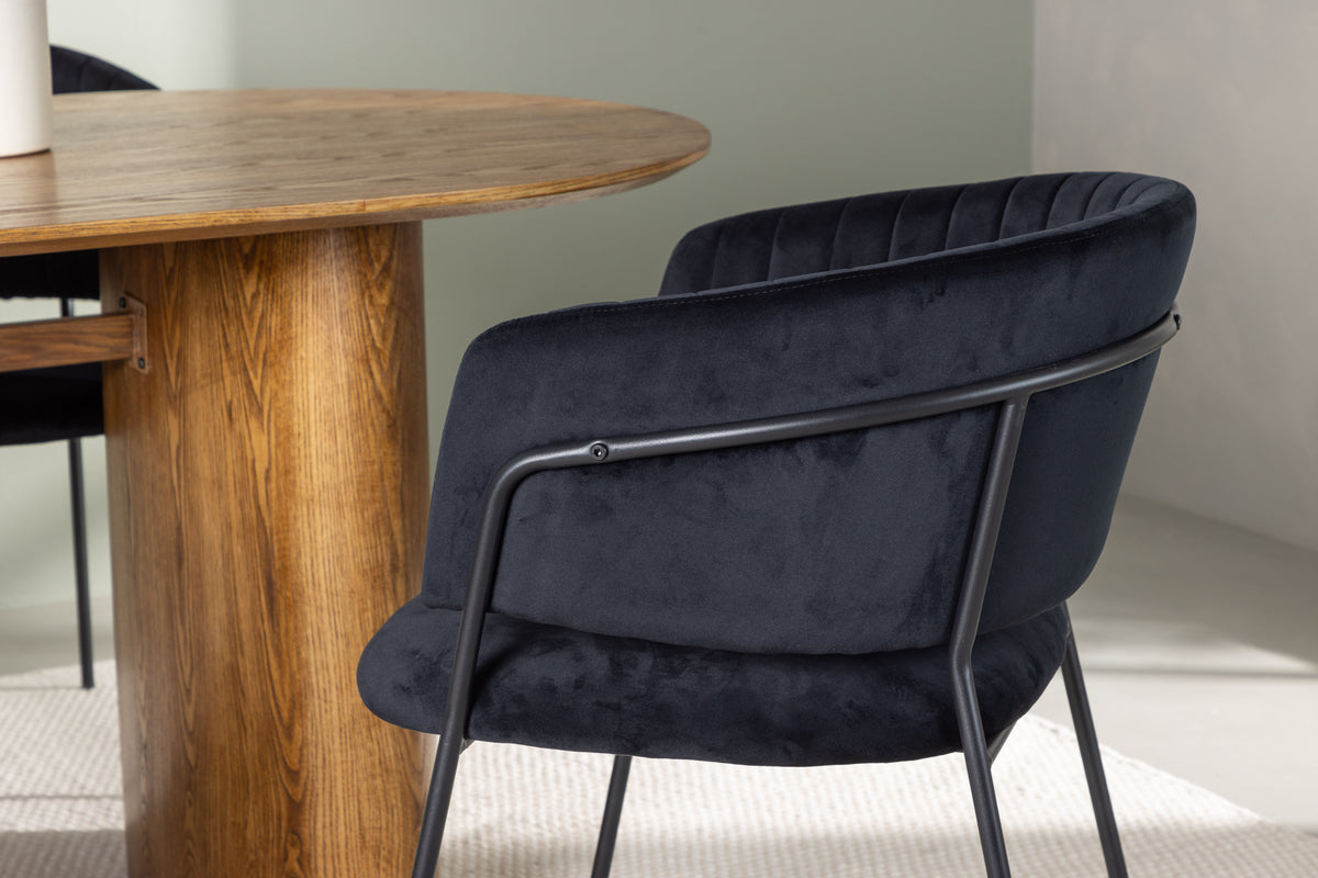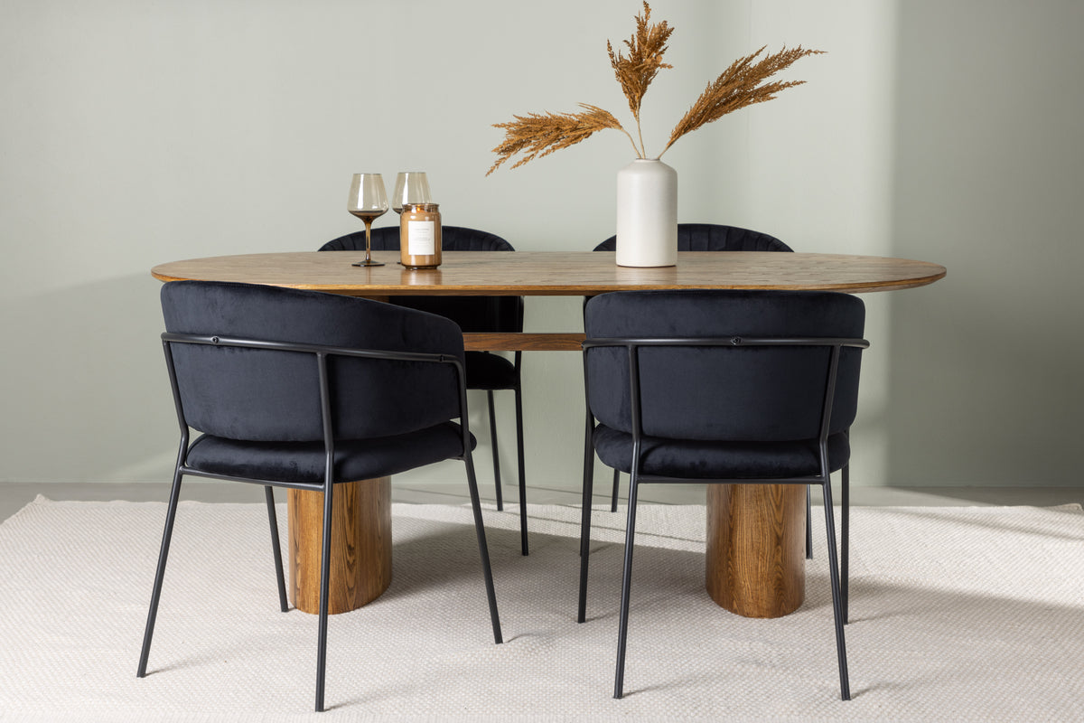 Sätt en personlig prägel på din inredning med en pampig matgrupp som utstrålar värme, harmoni och stil i vår nordiska design! Med det trendiga ovala matbordet i naturträ från serien Isolde tar vi din matsalsinredning till en helt ny nivå. Varje detalj är noggrant utformad. Med sin ovala bordsskiva i MDF och robusta stomme ger matbordet en känsla av hållbarhet och det levande materialet blir en snygg detalj till blickfånget. Bordets mått: 140x75cm. Tillsammans med det trä-färgade matbordet kommer våra svarta sammetsstolar Selma. Den helklädda designen med en lätt rundad rygg och en smidig sits i sammetstyg försäkrar inte bara maximal komfort utan också en estetiskt tilltalande upplevelse. De snygga dekorsömmarna lägger till en touch av lyx, medan stolsbenen i svart stål ger en modern kontrast. Låt Isolde och Selma bli själva hjärtat av ditt hem, där måltider blir till minnesvärda stunder. Gör dig redo att välkomna familj och vänner till en unik atmosfär av stil och harmoni!