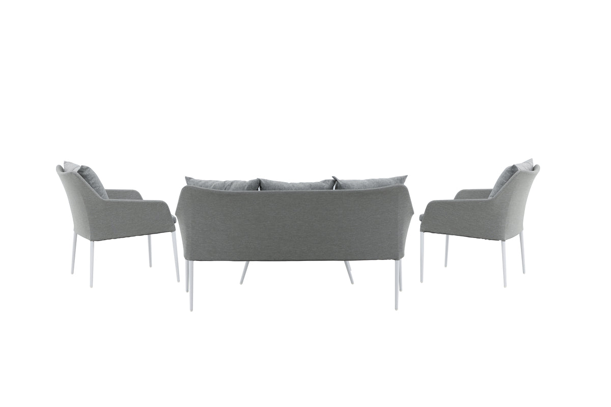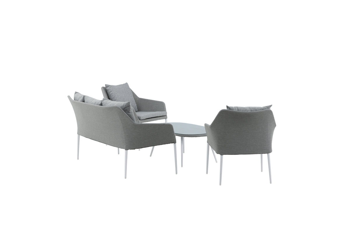 Spoga soffgrupp har en luftig design med raka nordiska former som kommer passa utmärkt på altanen eller i uterummet i sommar! Stommen är vit och sitsen tillverkad av grått tyg. Ett matchande soffbord tillkommer - möblera inbjudande och personligt!