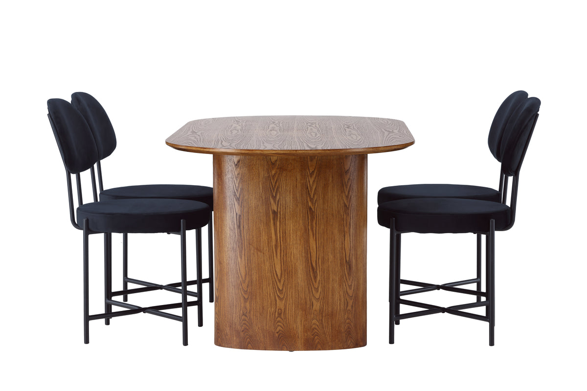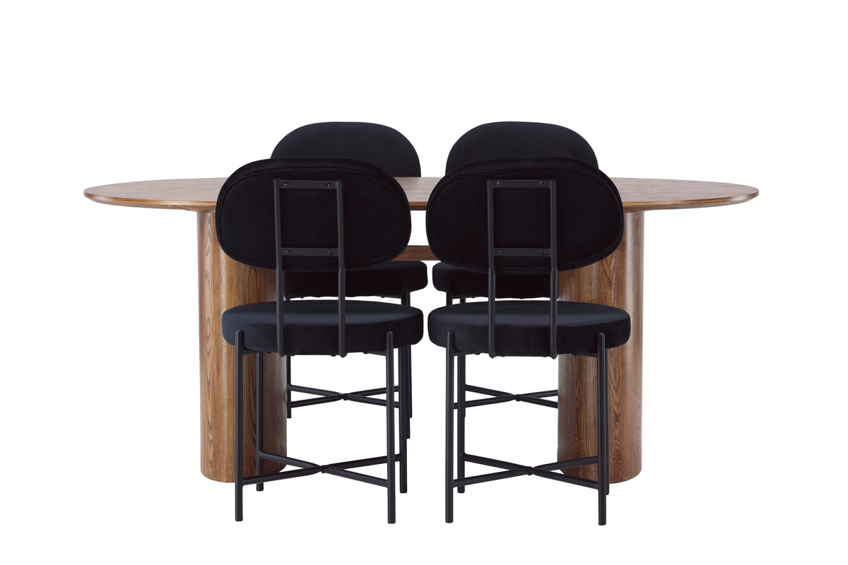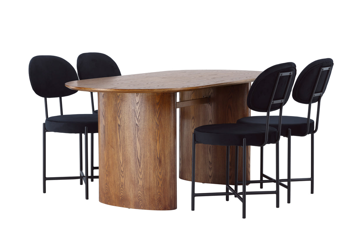 Ett modernt blickfång i ditt hem. Här får du en pålitlig matgrupp i robust stil som kommer stå stadigt i flera år och imponera på både dig och dina gäster! Det ovala matbordet Isolde, med sin trendiga naturträ kulör, kommer att bli hjärtat i ditt vardagsrum. Med en bordsskiva i MDF och en robust stomme utstrålar detta bord kvalitet och stadighet. Den levande materialet tillför en vacker rörelse som blir en dekorativ detalj. Bordets mått: 140x75cm. Tillsammans med våra svarta matstolar Stella bildar den här matgruppen en perfekt harmoni. Stolen förenar komfort och stil på ett fantastiskt sätt. Den trendiga skandinaviska designen kombinerar en rund sits och ryggstöd i lyxigt svart sammetstyg med minimalistiska stolsben i elegant svart stål. Denna kombination av material och form ger enastående komfort och en sofistikerad touch till din måltid. Njut av varje stund vid denna exklusiva matgrupp. Skapa en inbjudande atmosfär där du och dina nära och kära kan samlas för minnesvärda stunder och njut av god mat i stil och komfort!