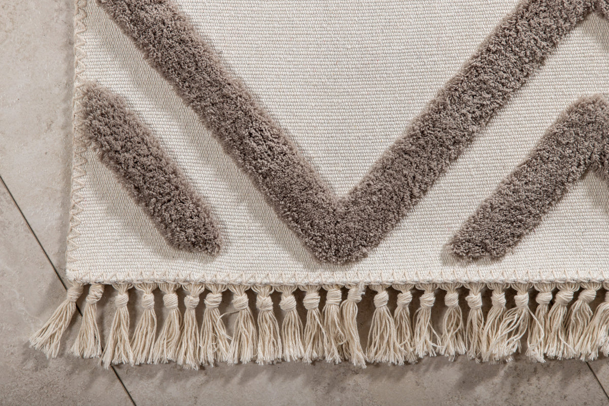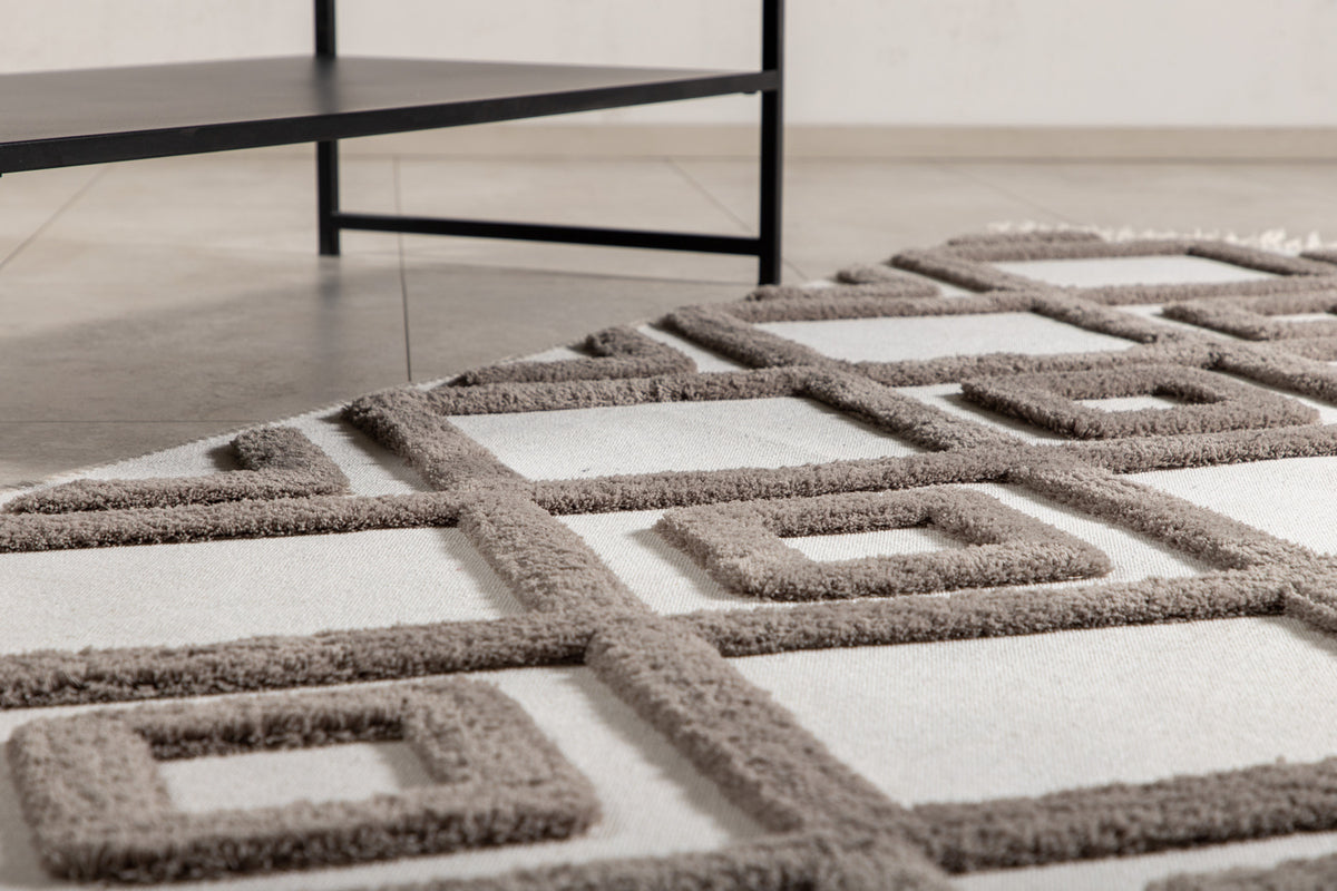 Inred hemmet med en modern matta som sätter tonen i rummet! Med polyestermattan Towa får du en värmande och mysig matta som drar blickarna till sig med sin unika utformning. Mattan har en stilren vit färg med ett vackert upphöjt, strukturerat mönster i brunt som som ger mattan ett läckert djup och rummet nya dimensioner. Mattan har även dekorativa fransar på kortsidorna som ramar in mattan snyggt. Placera i vardagsrummet eller på någon annan plats där den får uppmärksamheten den förtjänar! Mattan finns i olika storlekar och färger.