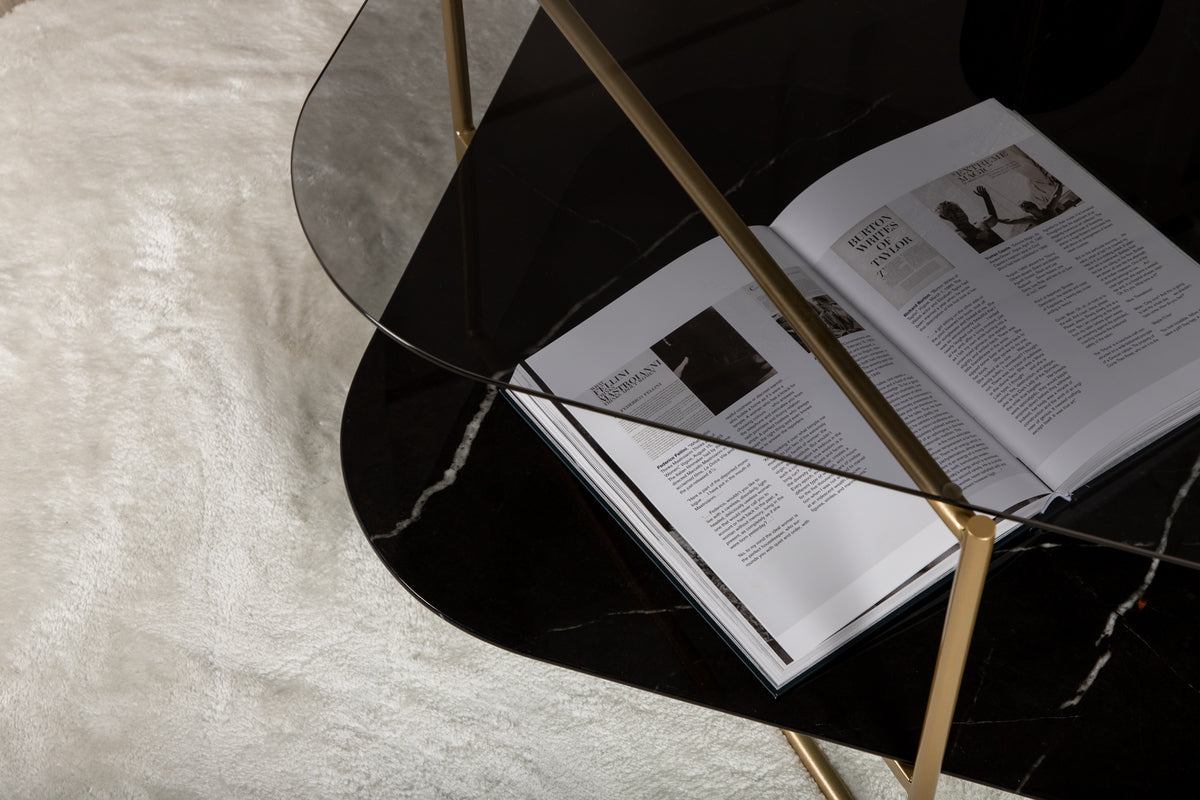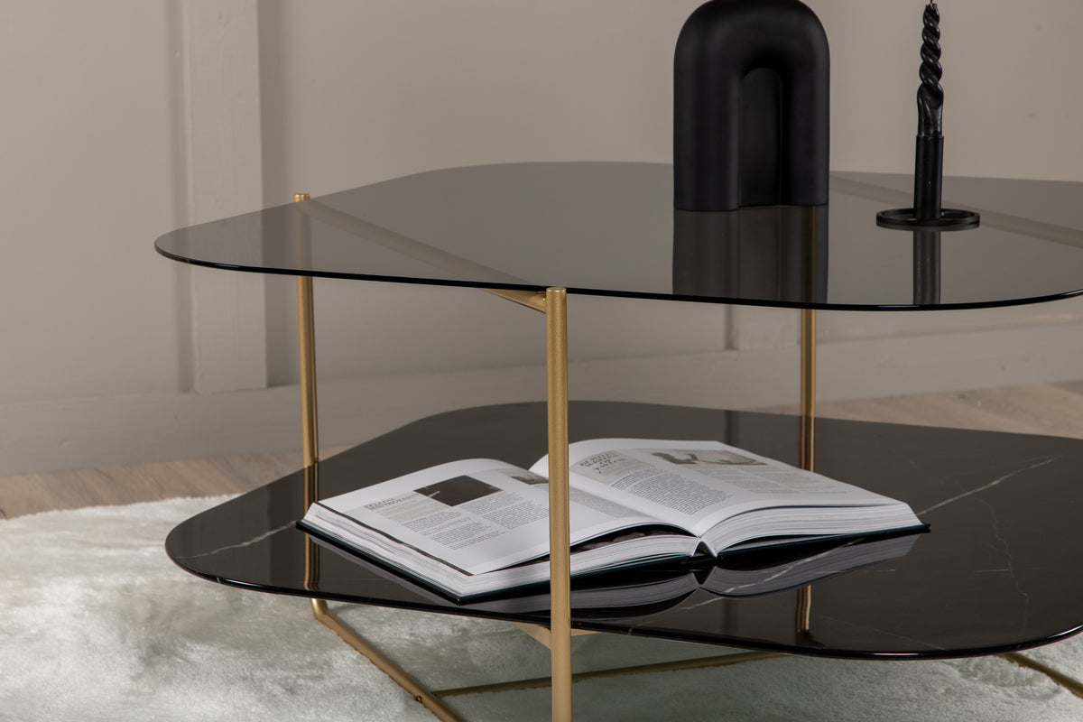 Skapa en stilmedveten atmosfär i vardagsrummet med det här iögonfallande soffbordet från serien Un-Line! Bordets design andas modernitet med sin tunna utformning och smala stomme i mässingsfärgad metall som bidrar till en luftig och lyxig look. Toppskivan är i rökigt svart glas och synliggör hyllplanets vackra stenskiva i svart marmorglas - lika snyggt som praktiskt. Un-Line blir en stilikon framför soffan och kommer garanetrat höja inredningsnivån i ditt hem. Bordets mått: 85x85x45 cm. Om Marmorglas: All sten är ett ” levande material” därav kan det variera av naturlig anledning från stenblock till stenblock. Dessutom skall man komma ihåg att detta är natursten, ingen sten är den andra lik, det är en del av charmen med naturmaterial som marmor. Följ våra skötselråd för mer tips så får du ett bord som står sig över tid!