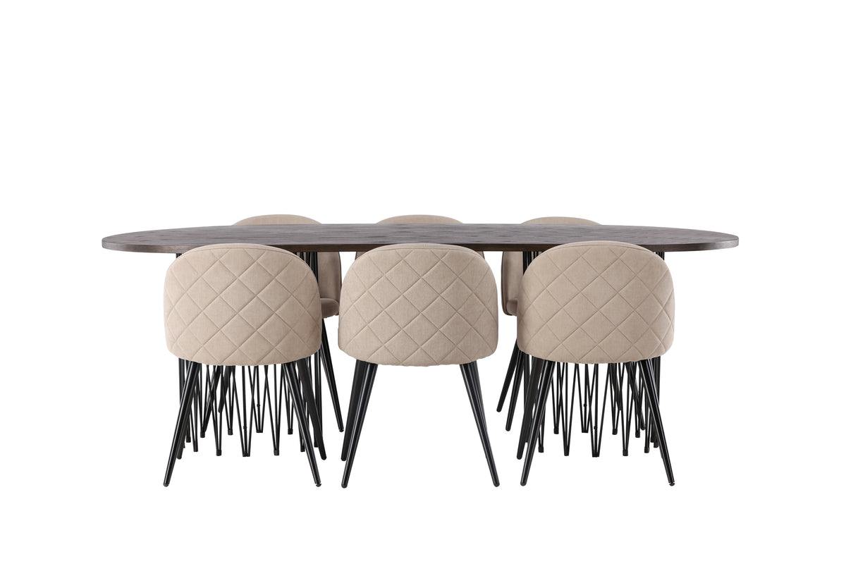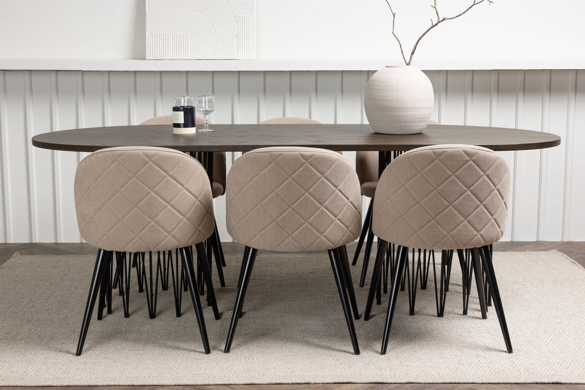 En underbar kombination av hög komfort och modern utformning! Vårt ovala matbordet Stone imponerar med sin modemedvetna design. Bordet har en vacker brunfärgad bordsskiva i MDF med faner och två dekorativa cylinderformade stommar i svart metall. Här i trendsäker kombination med matstolar från serien Velvet Stitches. Stolens rygg är rundad och precis som sitsen är den mjukt stoppad i beige polysterlinne med dekorativ dekorsöm och rutmönster på baksidan. Benen är lätt utsvängda i svart järn. Möblera trendsäkert i ditt hem! Bordets mått: 220x100cm.